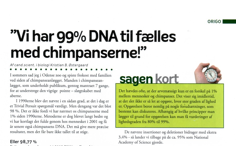 Hvorfor rinder dette udsagn mig i hu i forbindelse med denne påståede abe/menneske-lighed? Måske fordi den proklamerede enshed mellem mennesket og chimpansen baserer sig på en statistisk analyse af generne. Hvad den statistik er værd, kan man få en nærmere vurdering af i seneste nummer af Origo. (Se artiklen “Vi har 99 % DNA tilfælles med chimpanserne af Kristian B. Østergaard.)