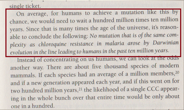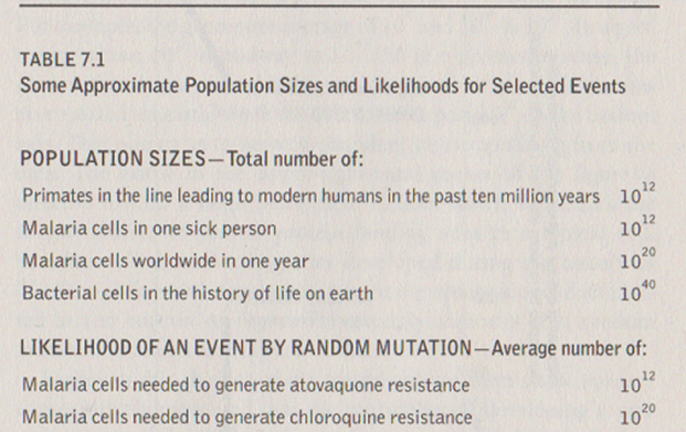 Der skulle altså 1020 malariaparasitter til, før den nævnte dobbeltmutation opstod tilfældigt. Sammenlign det med det formodede antal af primater ledende til mennesket over 10 millioner år, nemlig 1012.
