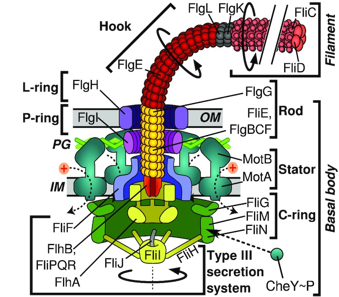 - Minamino T., Namba K., 2008, “Distinct roles of the FliI ATPase and proton motive force in bacterial flagellar protein export”, Nature 451(7177):485-8. https://doi.org/10.1038/nature06449